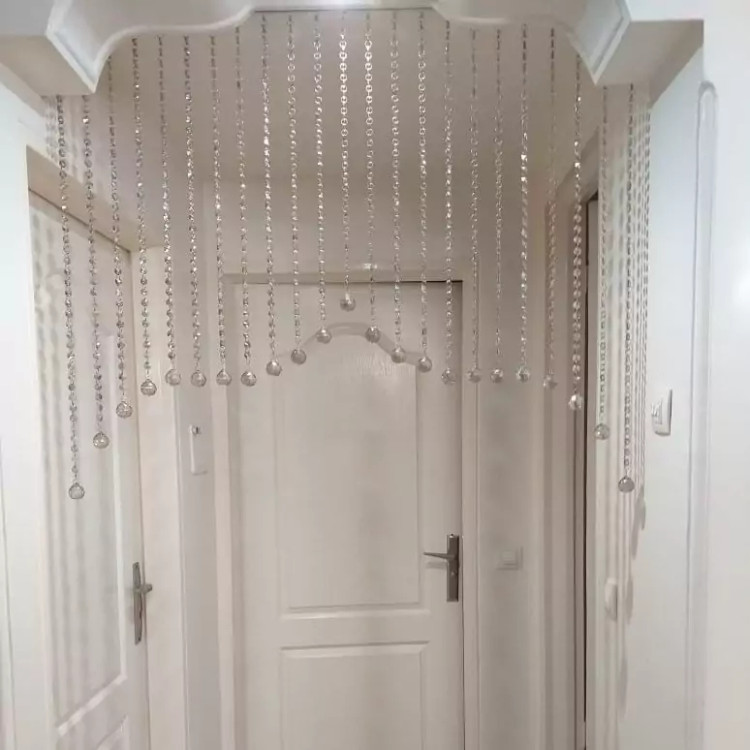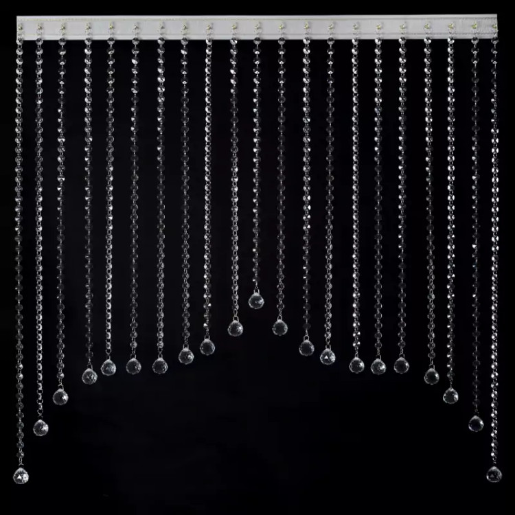 پرده کریستالی مدل ساسانی با عرض یک متر(قابل سفارش با هر اندازه ای) با فاصله پنج سانت بین رشته ها با ۲۱ رشته و ارتفاع بلندترین ۱۰۰ و کوتاهترین در قسمت شانه ۴۰ با گوی شماره سی در انتهای رشته ها به همراه چوب پرده مخصوص پرده کریستال با ریسه و گوی بیرنگ(قابل سفارش با ریسه ۷ رنگ و شامپاین)