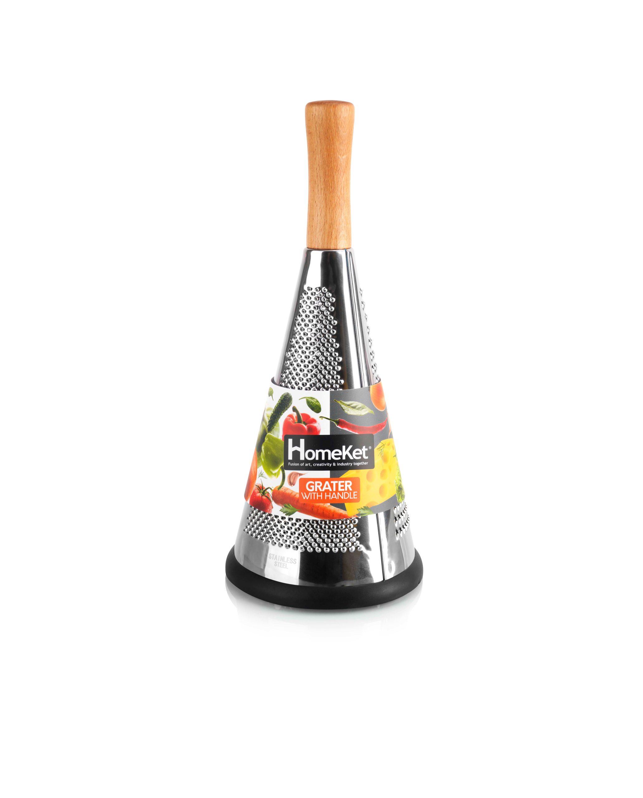 رنده مخروطی استیل دسته چوبی هوم کت یک ابزار مناسب و کاربردی برای هر آشپزخانه ای است. این محصول هوم کت وسیلهای سبک، ساده و بسیار کاربردی در زمان آشپزی است. دارای ۲ نوع صفحه برش برای رنده کردن مواد غذایی بهصورت رنده ریز و رنده درشت است. که با هر کدام از صفحه برشها میتوان مواد غذایی را رنده و یا سالاد را تزئین نمود. در آشپزخانه برای رنده کردن مواد غذایی مانند سبزیجات، سیفی جات، میوهها و حتی پنیر استفاده میشود.